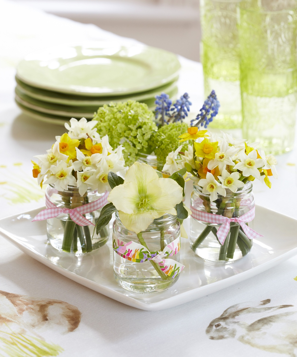 Narzissen und andere Blumen in vier Gläsern arrangiert als Blickfang