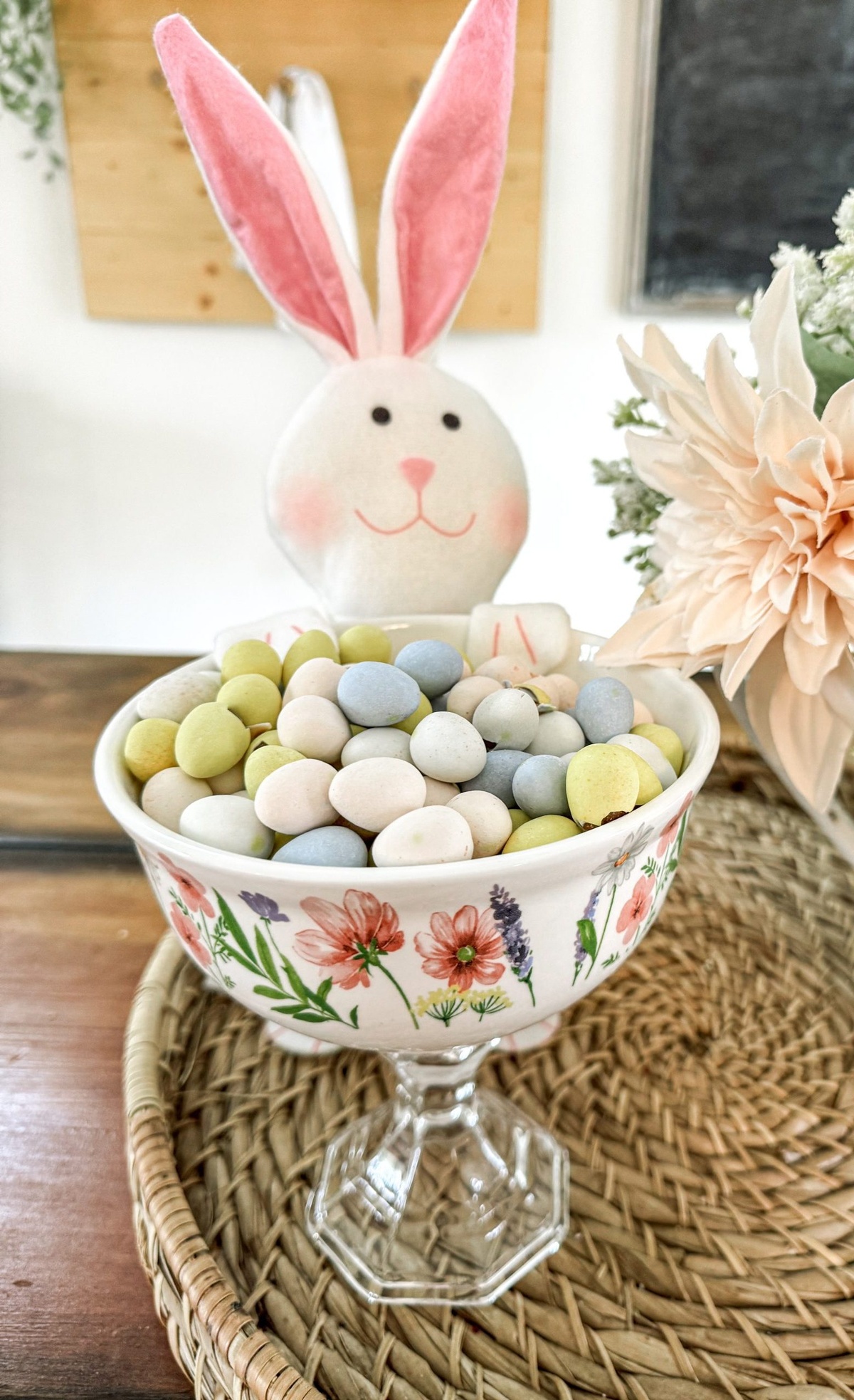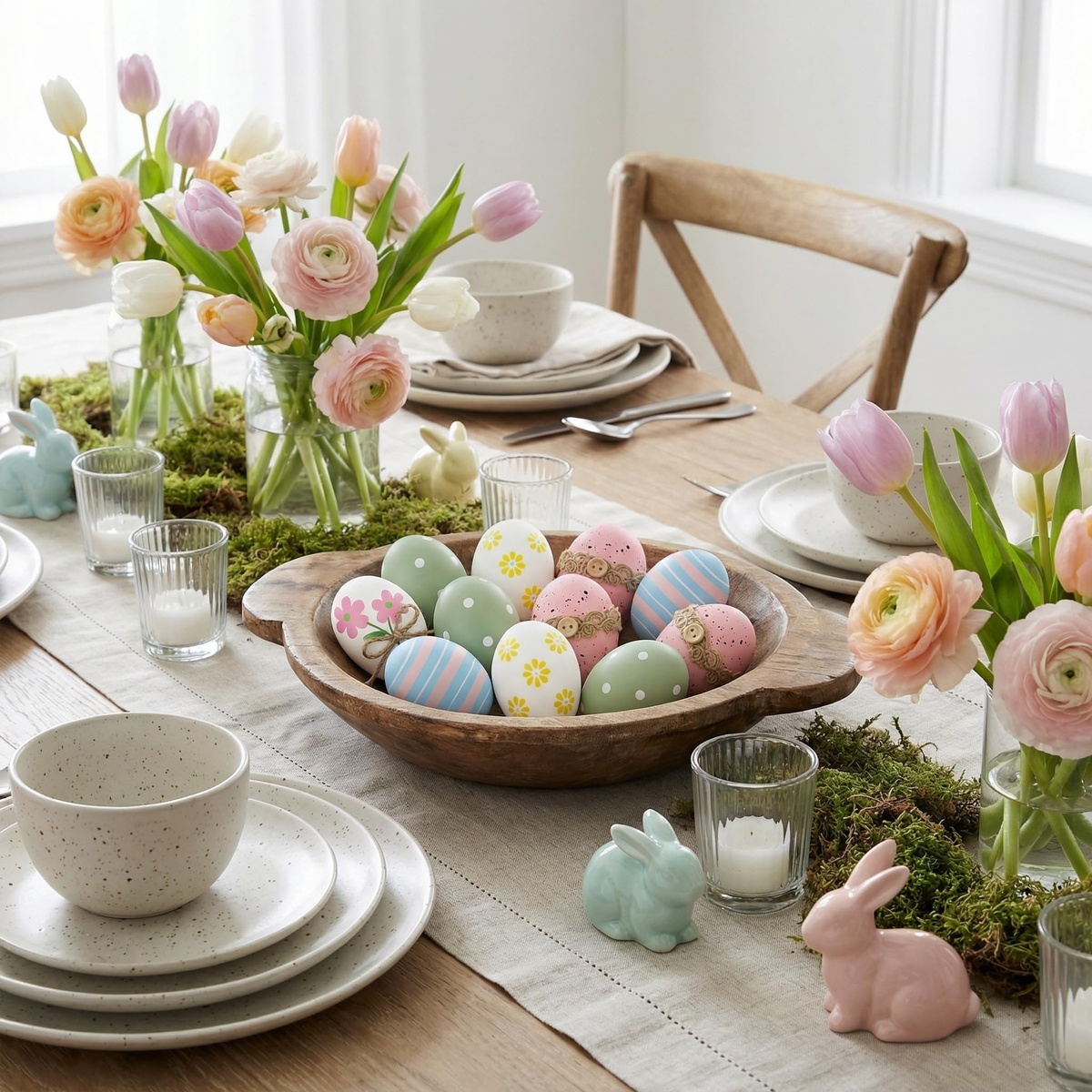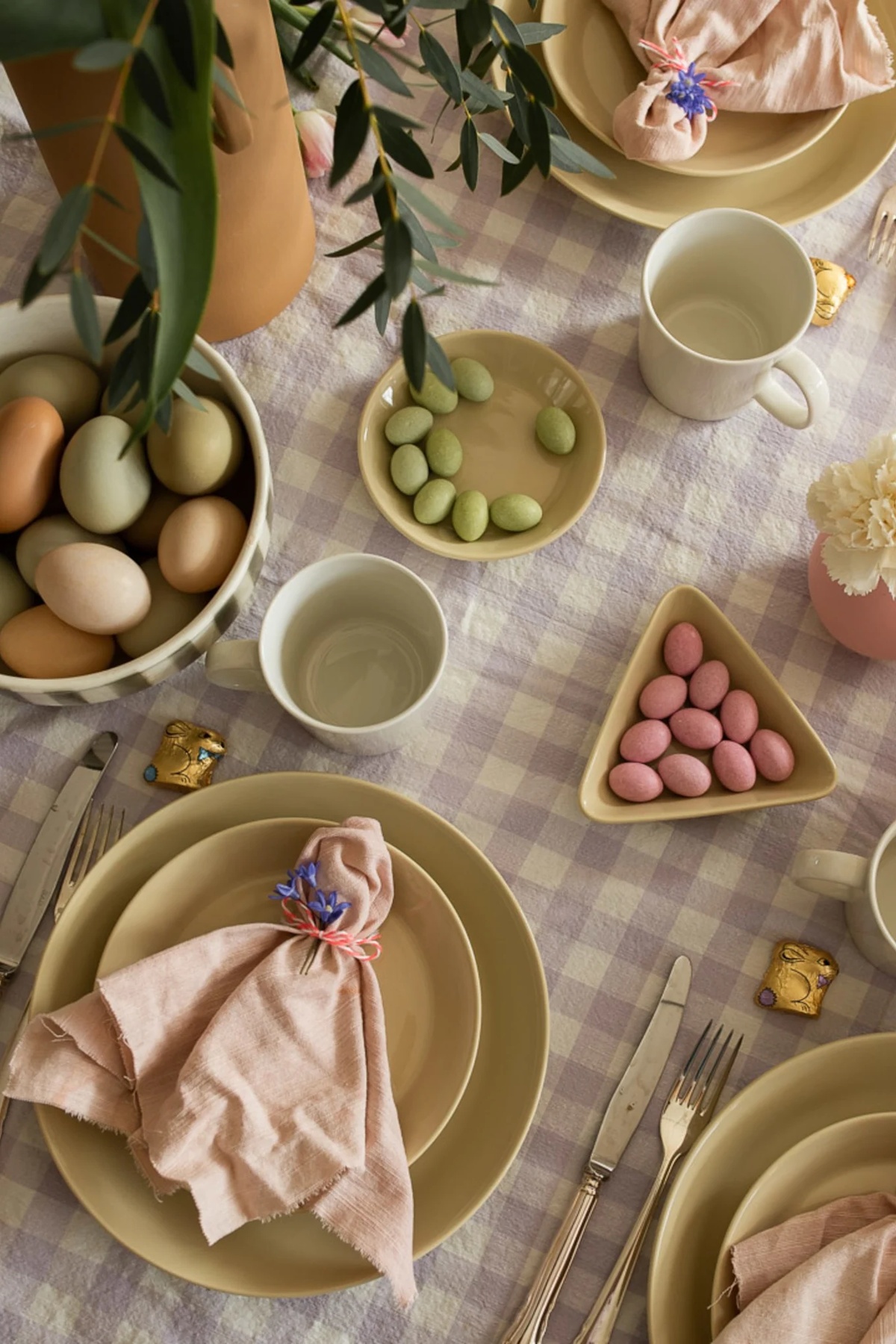 Kreative Tischdeko zu Ostern mit Frühlingsblumen und Eier in Pastellfarben