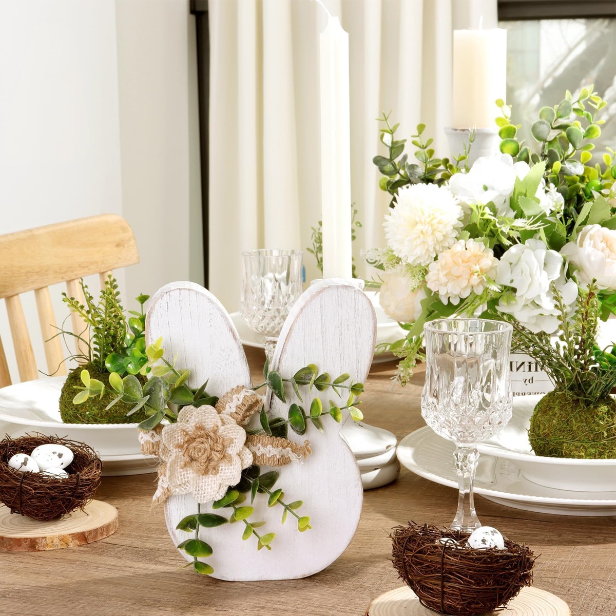 kreative Ideen zu Osterdeko - Nester mit Eiern, gebastelter Hase, Blumen