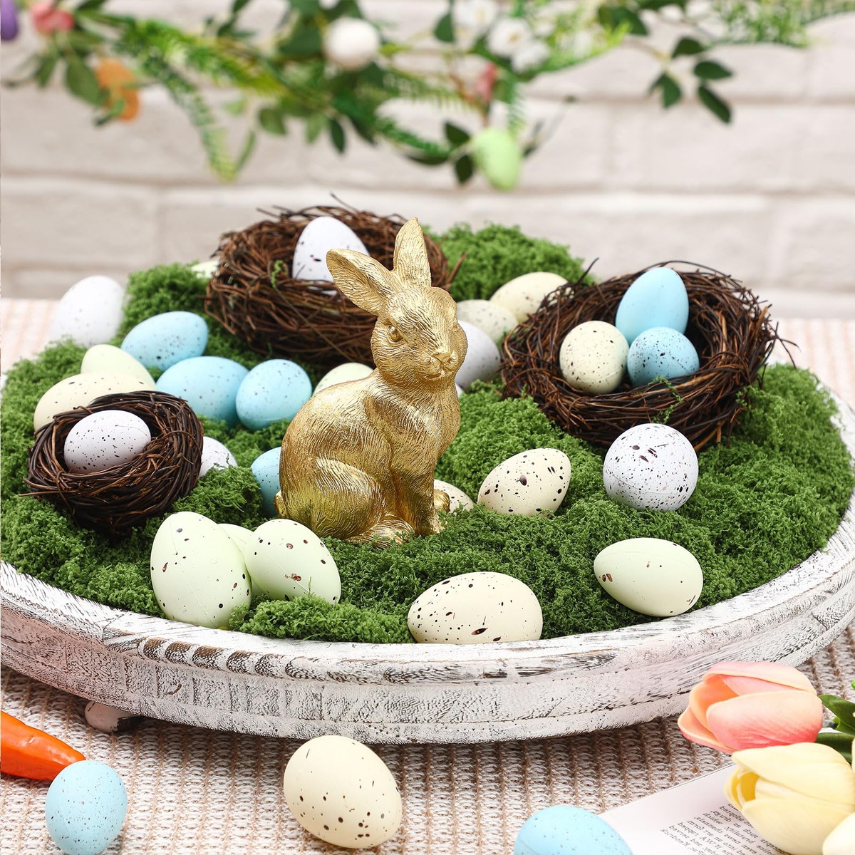 Blickfang auf dem Tisch - rundes Tablett mit Ostereiern und Hasen dekoriert