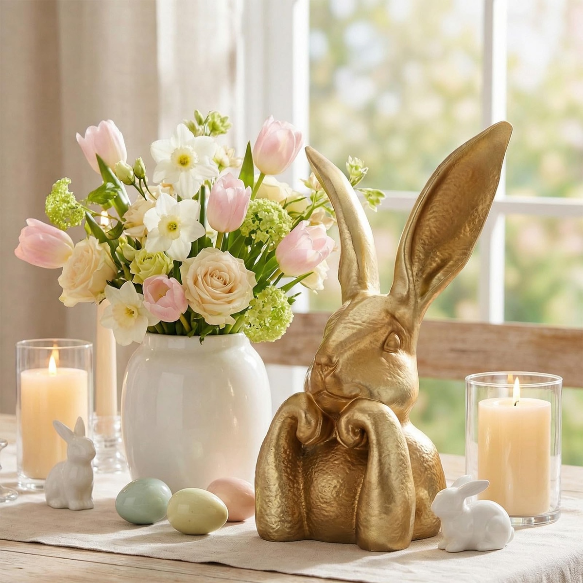 Frühlingsblumen in Vase, Hasen, Ostereier und Kerzen - Tischdeko zu Ostern