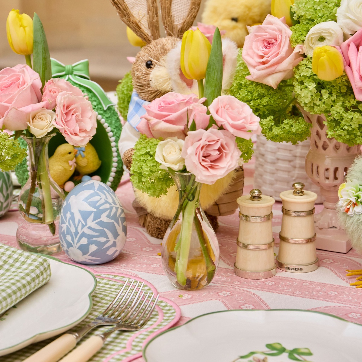 einzelne Elemente in der Tischdeko - Blumen, Eier, Hase, Küken