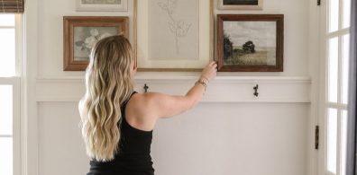 Der Barcelona Tisch und die Stühle von Dedon zeigen die “perfekte weiße Farbe ”, sagt die Inhaberin Lisa Sterio. Das Kunststück nimmt sie jedes Mal heraus und hängt es an der Wand, wenn sie eine Party draußen organisiert. Sie stellt auch die überdimensionierten Blumentöpfe draußen. Dort bringen die eingepflanzten Hortensien dramatische Höhe und üppige Grüne in das Ambiente der Terrasse ein.